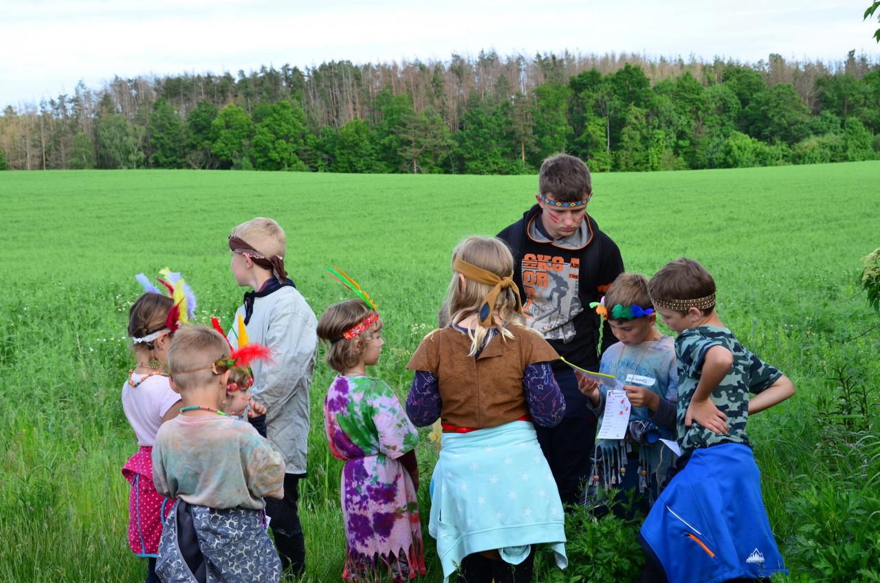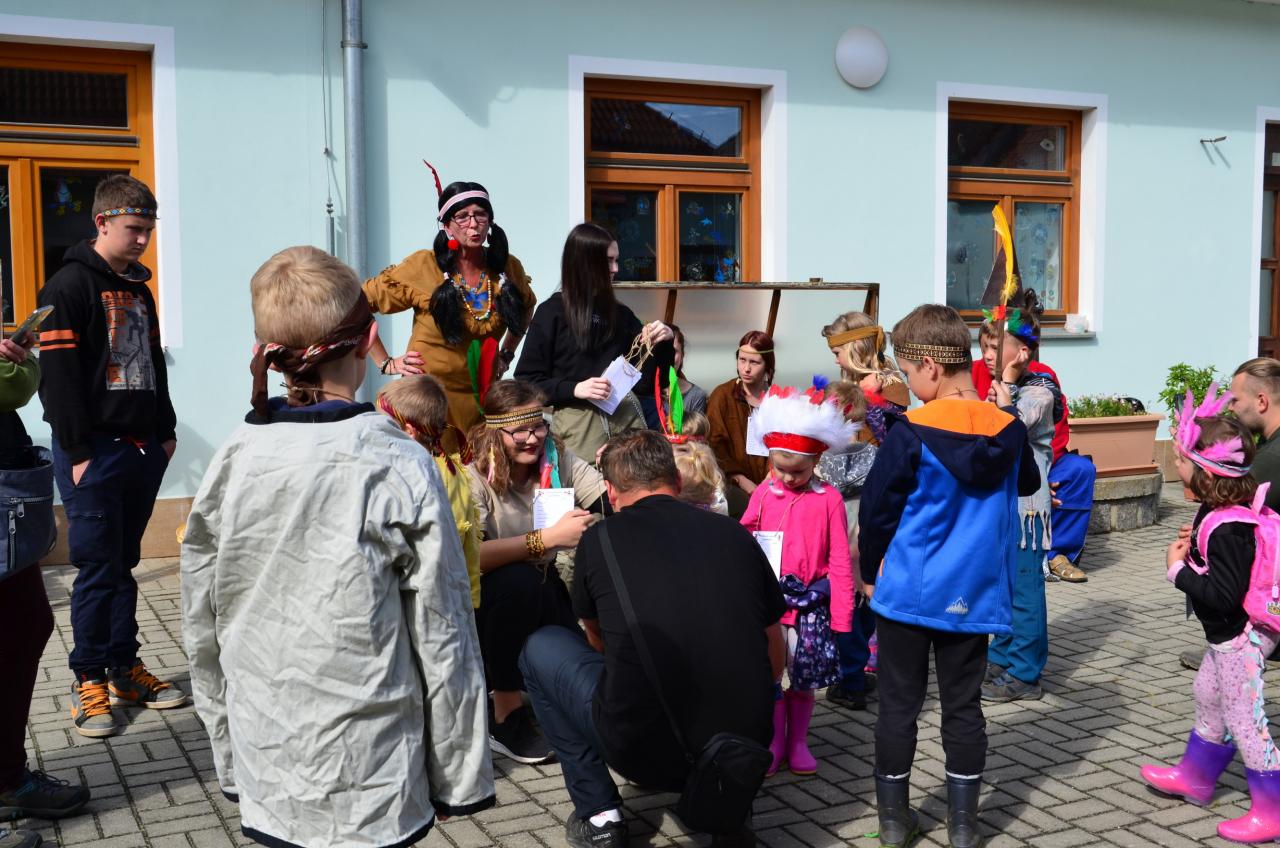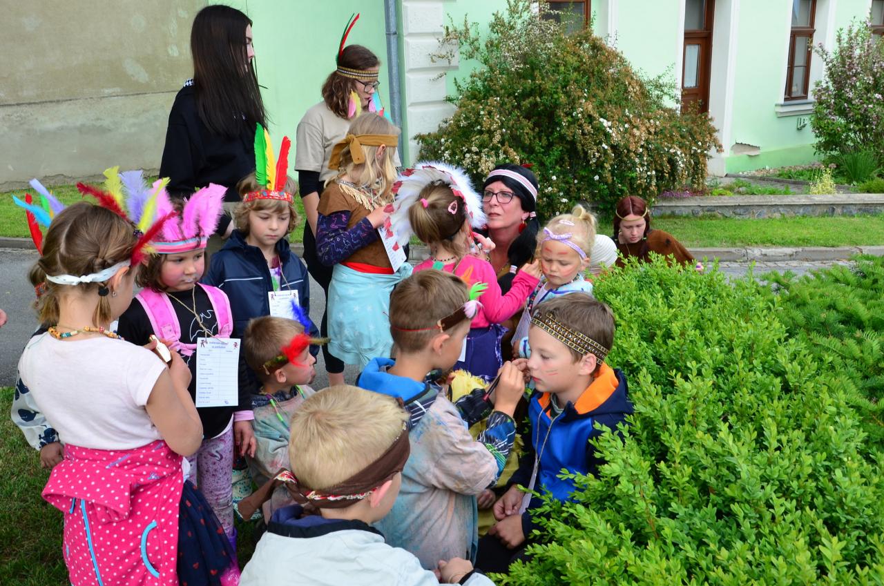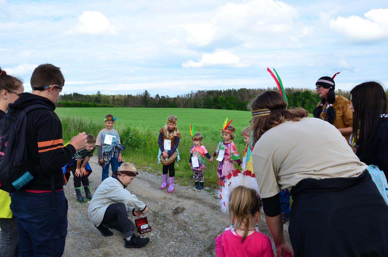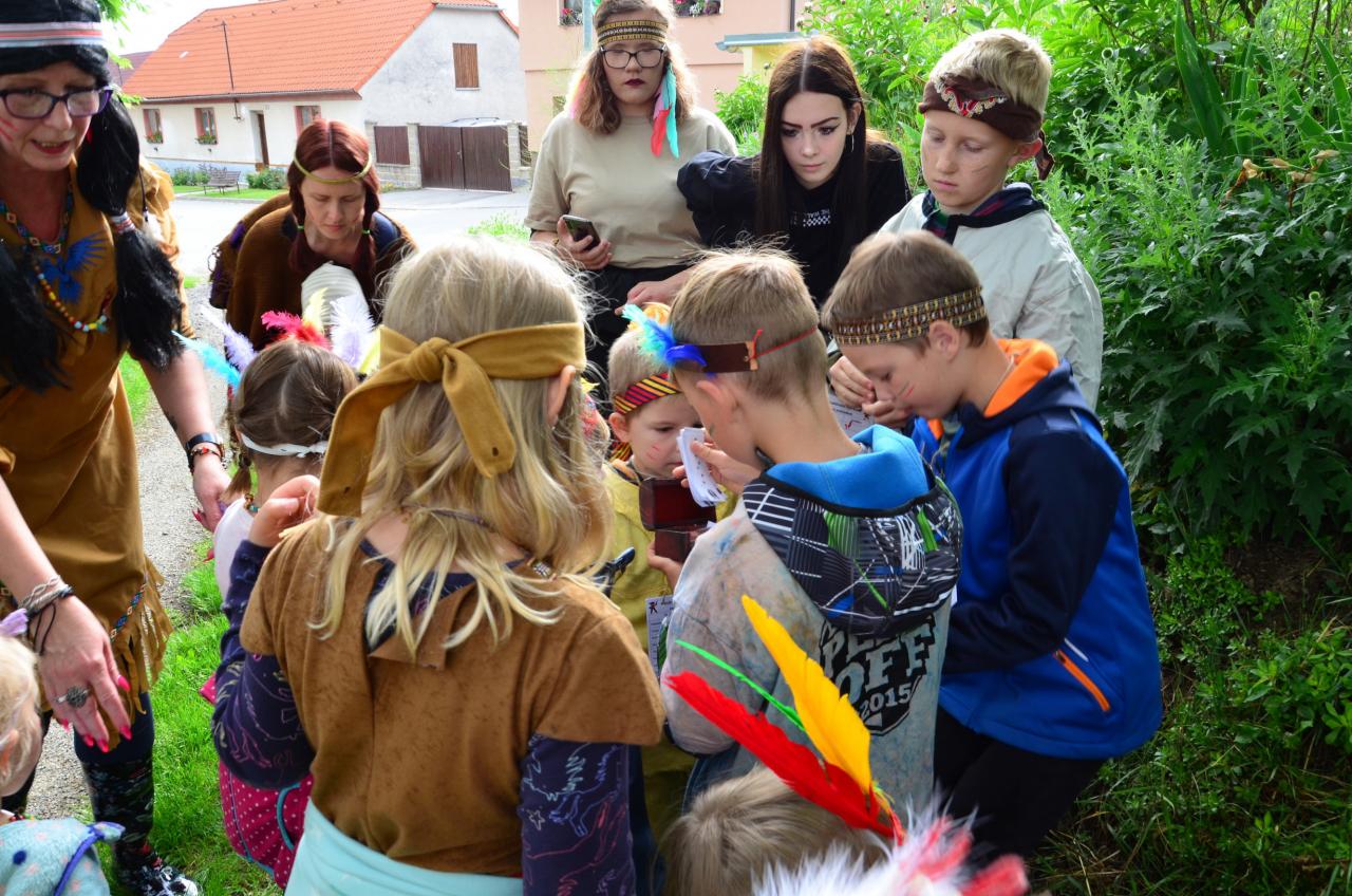 Místní indiáni Petrůkyjové se sešli před místní knihovnou. Tam už na ně čekal první úkol - hledání čísel na školním dvoře. Po indiánské poradě se vydali hledat vysněný poklad. Během celé trasy museli splnit několik úkolů.