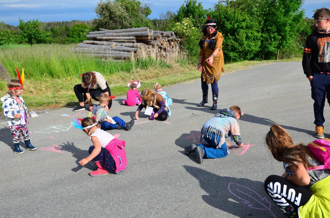 - Malování indiánských symbolů barevnými křídami.