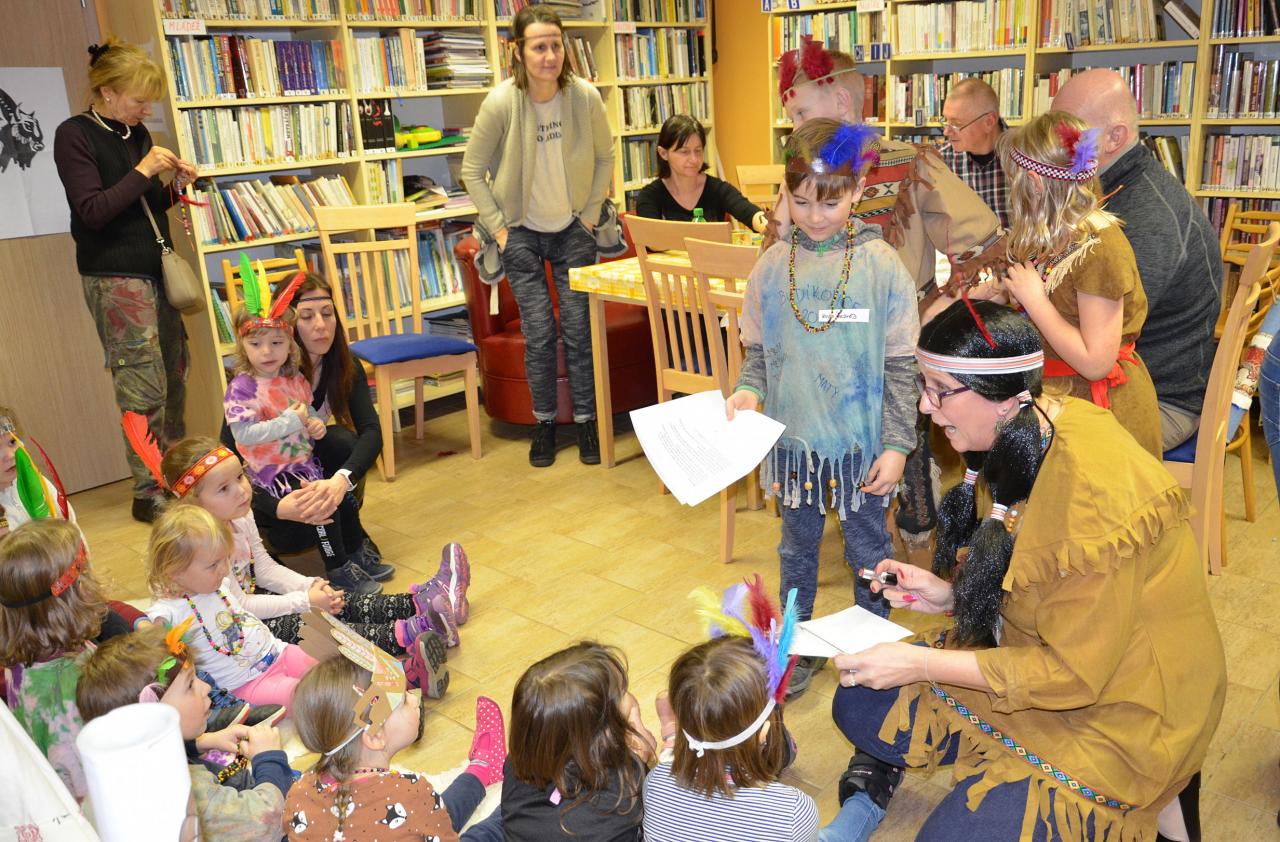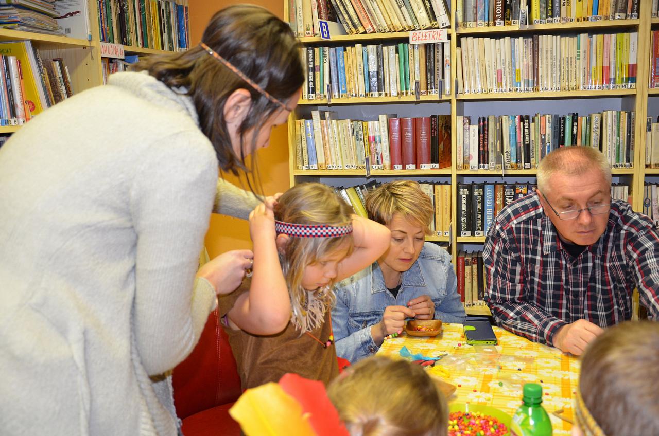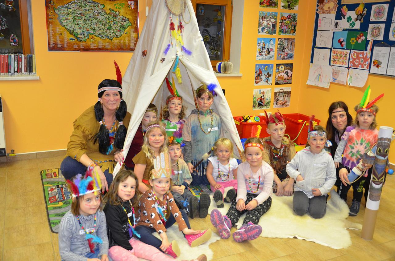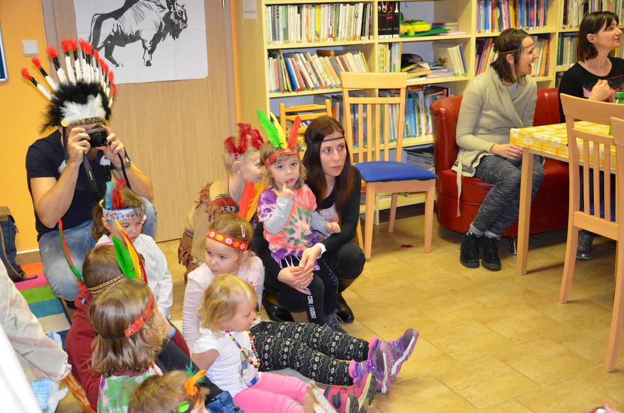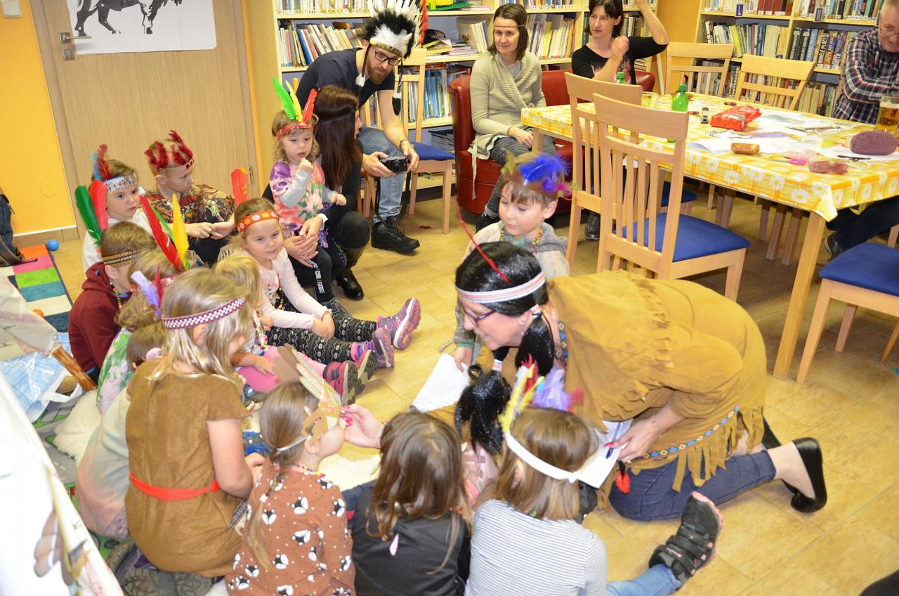 Tentokrát děti navštívily knihovnu v indiánských oblecích a čelenkách. Někteří dospělí nezůstali pozadu a taky se na tuto akci skvěle vyparádili.