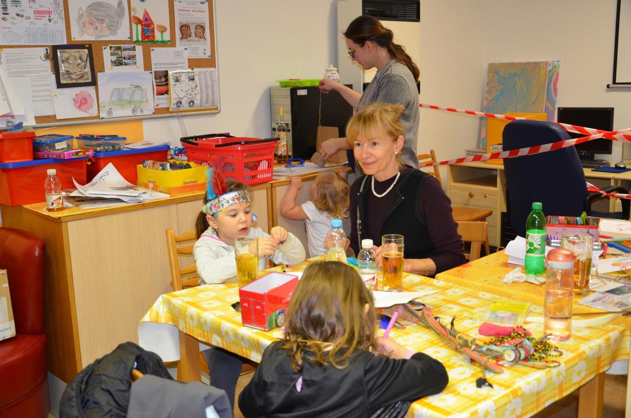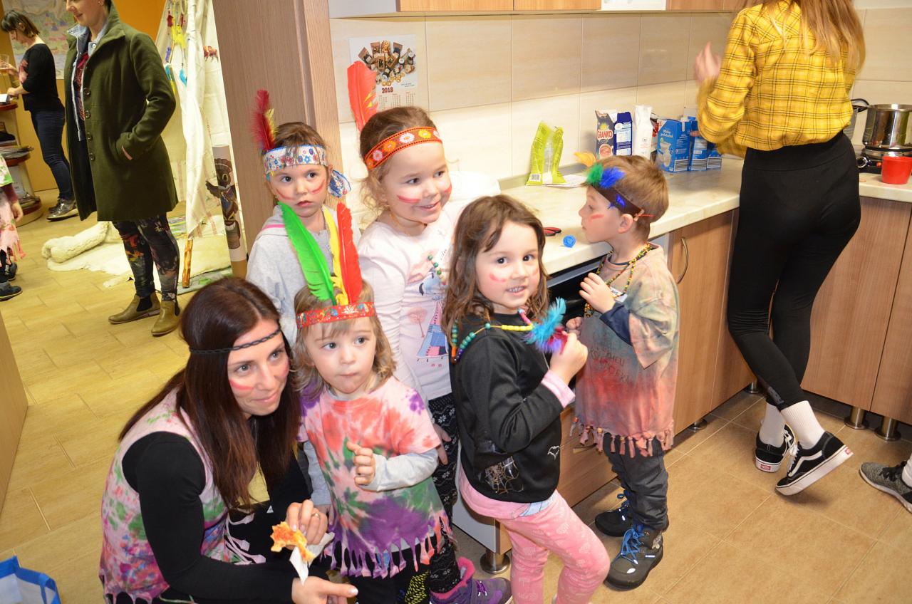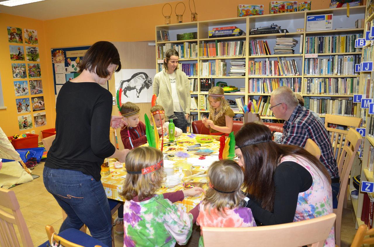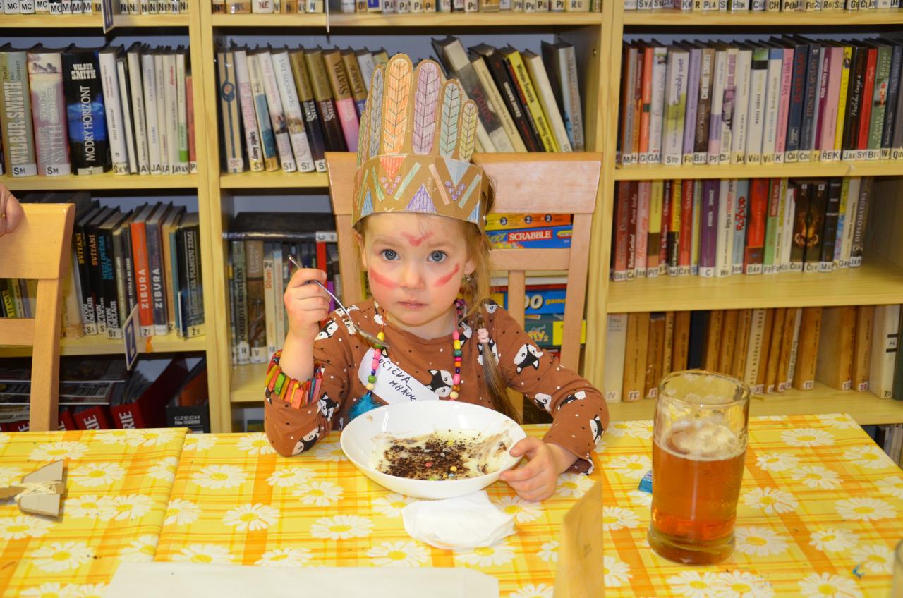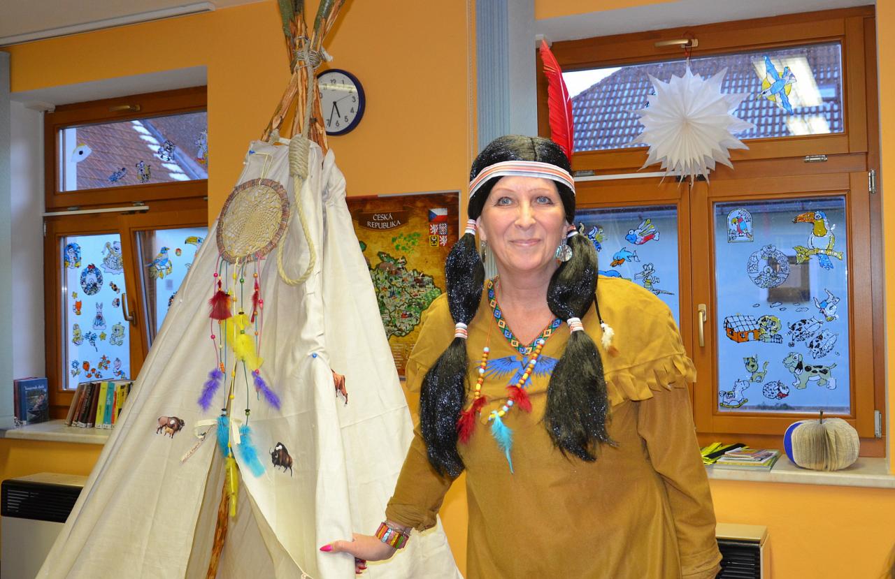 Tentokrát děti navštívily knihovnu v indiánských oblecích a čelenkách. Někteří dospělí nezůstali pozadu a taky se na tuto akci skvěle vyparádili.