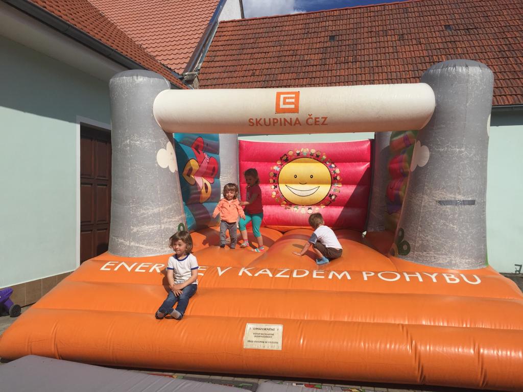 Počasí nám přálo a mohli jsme na plno využít prostory školního dvora. Pro děti byl nachystán skákací hrad a soutěže - turnaj v mölkky, házení mincí do kbelíku s vodou, střelba na kelímky, přetahování lanem, pojídání koblížků na čas, výdrž - držení papíru kolíčkem na prádlo. Nejmenší děti se pak mohly vyřádit prstovými barvami na plátně.